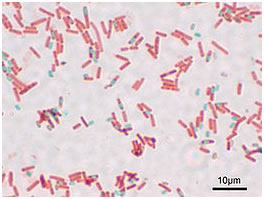 A stained preparation of Bacillus subtilis showing endospore as green and the vegetative cell as red